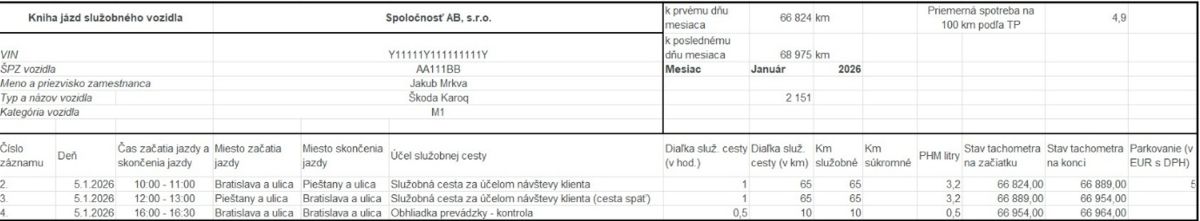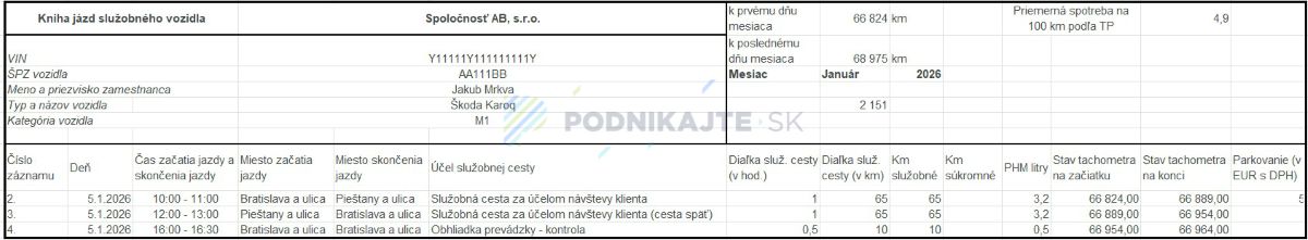 - účel jazdy preukazujúci použitie vozidla na podnikanie - označenie „služobná jazda“ nie je postačujúce na preukázanie 100 % nároku na odpočet DPH v zmysle zákona o DPH; odporúčame uvádzať konkrétny účel (napr. „návšteva klienta XY“, „servisné rokovanie“, „obhliadka prevádzky“ a pod.);