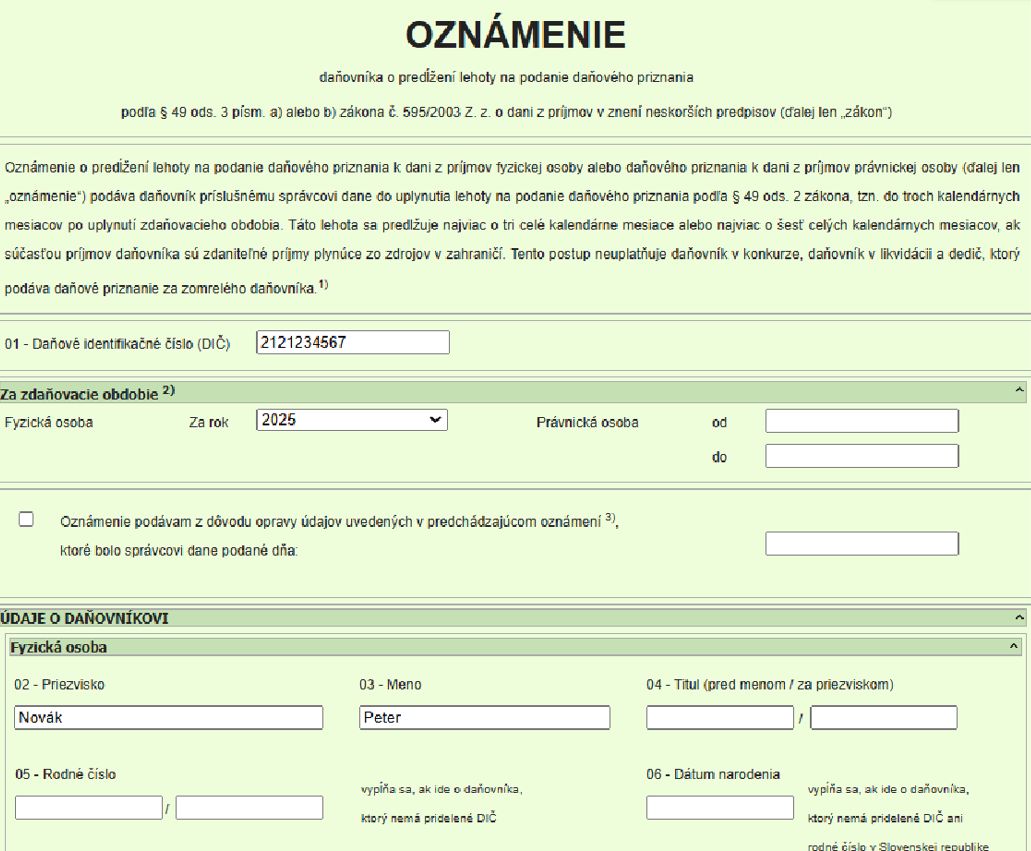 Vyplnenie tlačiva oznámenia o predĺžení lehoty za rok 2025 - fyzické osoby