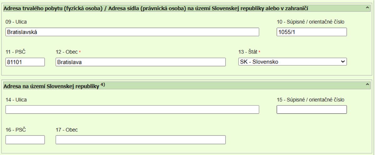 V bodoch 4. a 5. postupuje právnická osoba rovnako ako fyzická osoba, pričom ak má právnická osoba sídlo v zahraničí, v časti „Adresa na území Slovenskej republiky“ uvedie daňovník umiestnenie stálej prevádzkarne alebo organizačnej zložky.