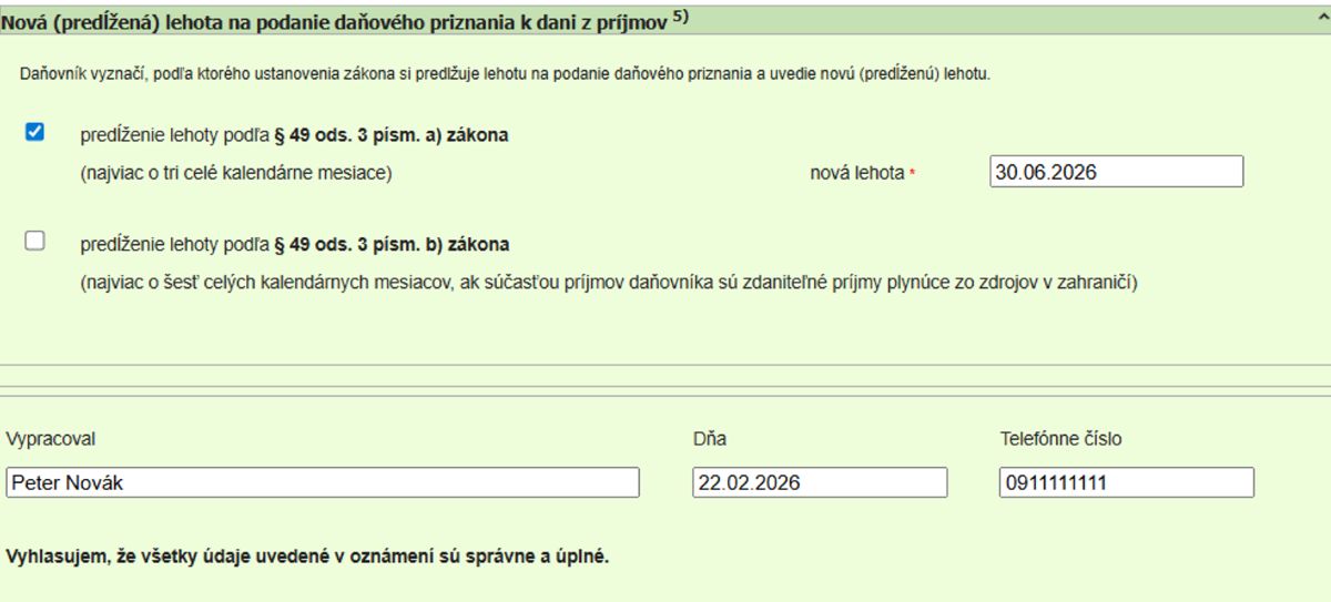 Daňovník vyznačí priamo v oznámení dátum, do ktorého predlžuje lehotu na podanie daňového priznania – tzn. do 30.04.2026, do 31.05.2026, do 30.06.2026, do 31.07.2026, do 31.08.2026 alebo do 30.09.2026. V oznámení sa uvedie vždy posledný deň mesiaca bez ohľadu na to, či ide o víkend alebo deň pracovného pokoja. Ak však koniec mesiaca pripadne na víkend či deň pracovného pokoja, lehota na podanie daňového priznania, resp. zaplatenie dane, sa posúva na najbližší nasledujúci pracovný deň.