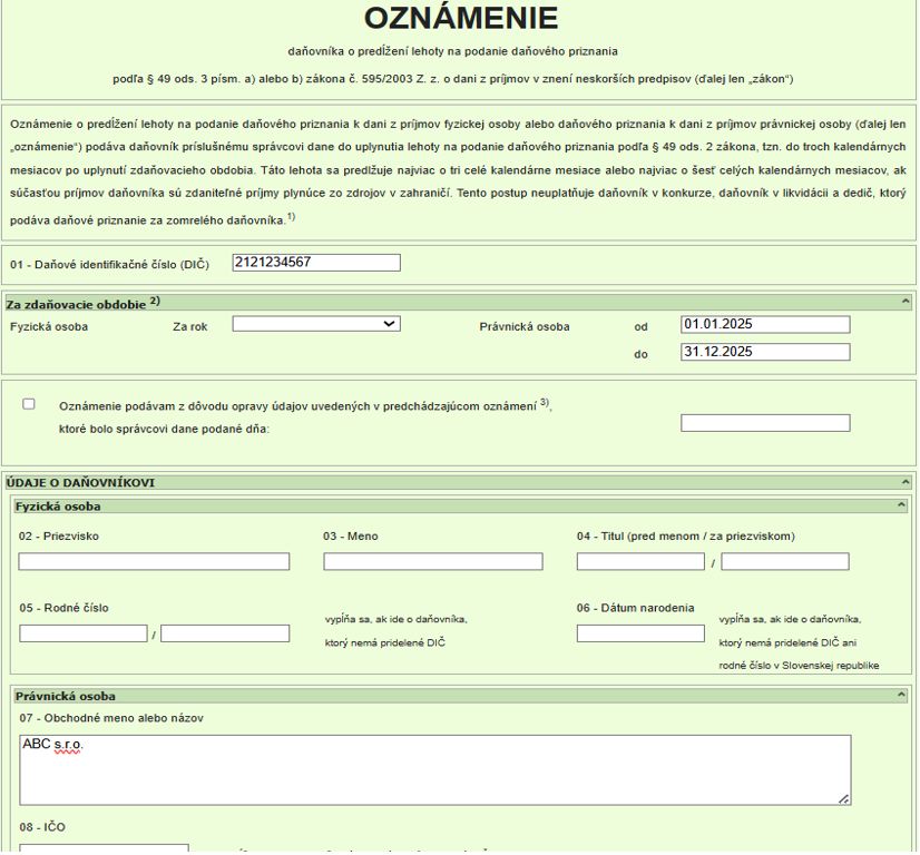 Vyplnenie tlačiva oznámenia o predĺžení lehoty za rok 2025 - právnické osoby