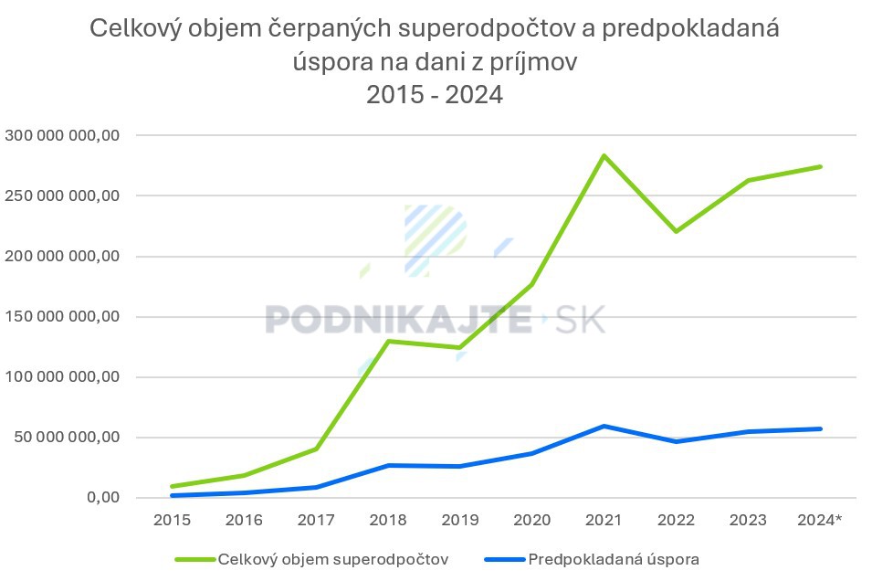 Na druhej strane, so znížením sadzby v roku 2022 superodpočet využilo menej firiem a znížil sa aj jeho celkový objem o zhruba 60 000 eur medziročne. Faktorov, ktoré to zapríčinili, ale mohlo byť viac. V tom roku napríklad ešte stále prebiehala pandémia koronavírusu a rozpútal sa tiež konflikt na Ukrajine.