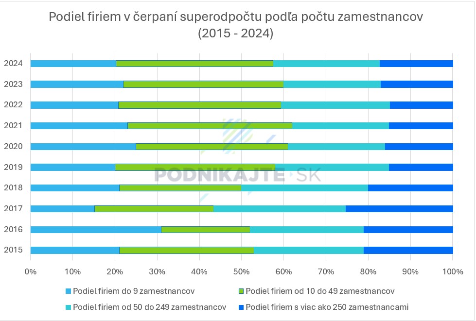 V najväčšom objeme superodpočet využívajú veľké firmy. Avšak, aj mikropodniky a malé firmy túto formu daňového zvýhodnenia využívajú, hoci s nižšou priemernou čerpanou sumou. Napríklad v roku 2016 bol podiel mikropodnikov v čerpaní superodpočtu najväčší spomedzi všetkých veľkostných kategórií spoločností – až 31 %. Neskôr sa znížil a drží sa približne na 20 % úrovni. Podiel firiem od 10 do 49 zamestnancov tvorí v priemere každoročne cca 35 %.