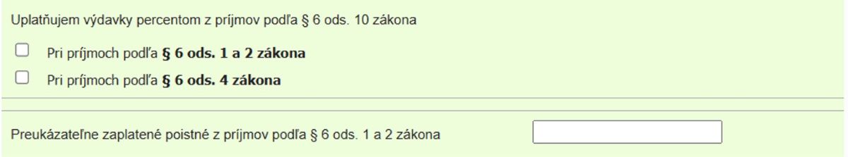 Podľa § 6 ods. 10 zákona o dani z príjmov platí, že v sume paušálnych výdavkov sú zahrnuté výdavky daňovníka okrem zaplateného poistného a príspevkov, ktoré je daňovník povinný platiť, ak toto poistné a príspevky neboli zahrnuté do základu dane v predchádzajúcich zdaňovacích obdobiach. Takéto poistné a príspevky si môže daňovník uplatniť vo výdavkoch v preukázanej výške.