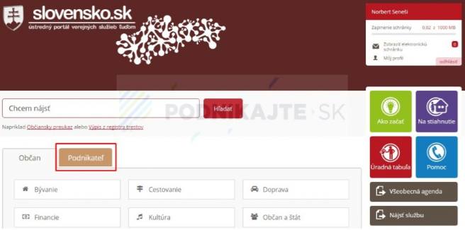- Na stránke sa vám objaví niekoľko kategórií elektronických služieb s dvoma záložkami. Spomedzi ponúkaných elektronických služieb máte možnosť vybrať si medzi tými, ktoré sú určené občanom (pod záložkou „Občan“) a ktoré sú určené podnikateľom (pod záložkou „Podnikateľ“). V našom prípade kliknite na záložku „Podnikateľ“.