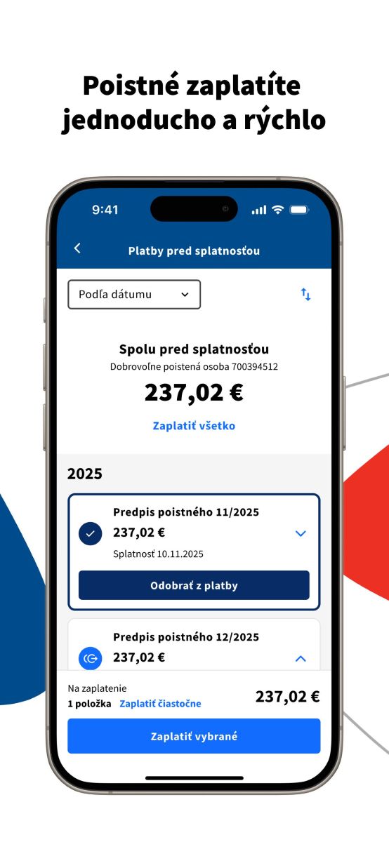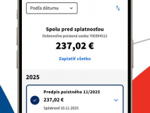 - ak je poistenec samostatne zárobkovo činná alebo dobrovoľne poistená osoba, uhradí poistné a nedoplatky online priamo v aplikácii štandardnými platobnými metódami, ktoré podporujú platby Google Pay, Apple Pay.