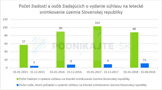 Nižšie uvedený graf sprostredkúva informácie o počte leteckých snímkových materiálov predložených na posúdenie Ministerstvu obrany Slovenskej republiky v období od 01.01.2015 do 31.08.2018. Je tu uvedený aj počet osôb, ktoré v sledovanom období letecké snímkové materiály predložili Ministerstvu obrany Slovenskej republiky na posúdenie.