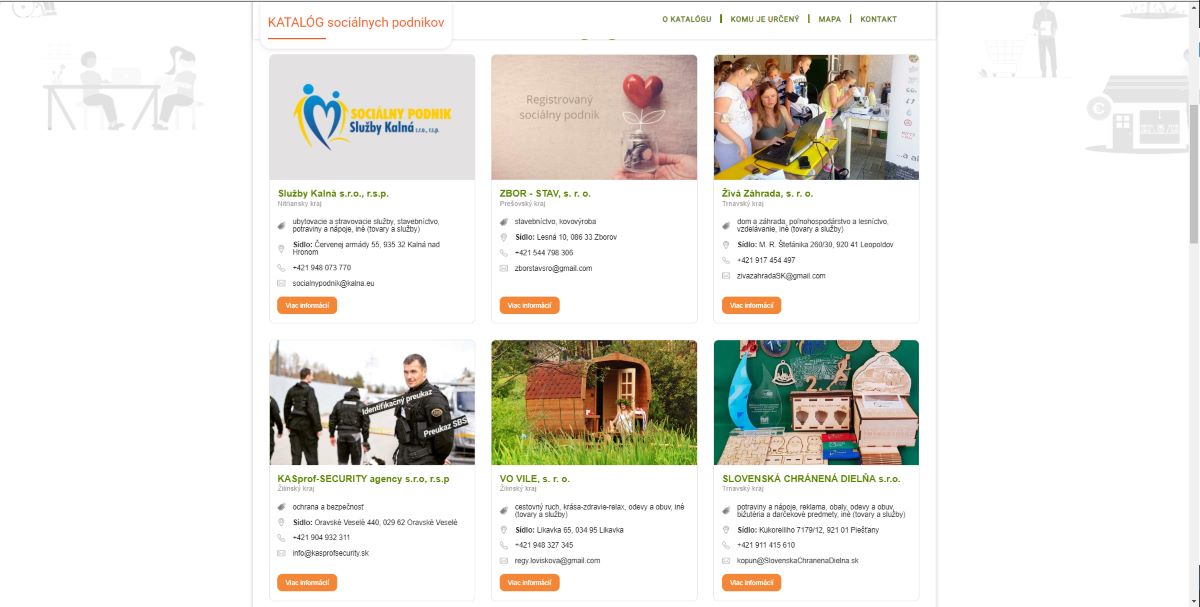 Katalóg obsahuje podrobné informácie o vyše 300 registrovaných sociálnych podnikoch na Slovensku. Možno v ňom nájsť všetky ich dostupné kontaktné údaje, informácie o právnej forme, kedy podnik získal štatút „registrovaný sociálny podnik", počet jeho zamestnancov, linky na webové stránky a profily na sociálnych sieťach.