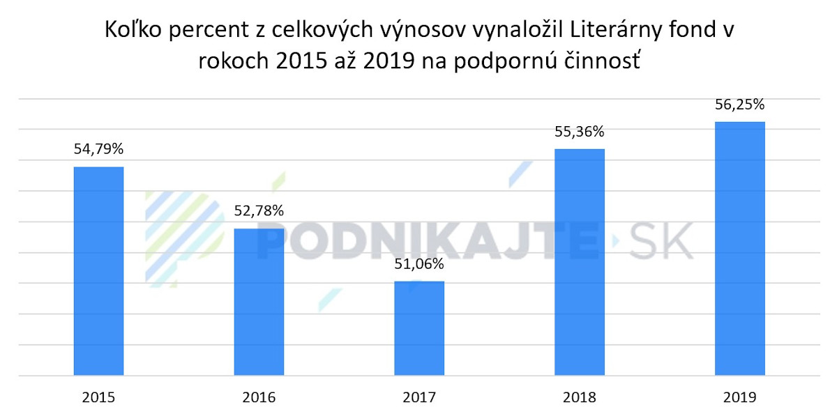 Úroveň poskytovania podpory zo strany Literárneho fondu je však vhodné merať aj tak, že percentuálne vyjadríme to, akú časť zo svojich celkových výnosov Literárny fond vynakladá na podpornú činnosť. Tieto údaje sa nachádzajú v nasledujúcom grafe. Literárny fond v rokoch 2015 až 2019 z celkových ročných výnosov používal len 51 až 56 % na to, aby z týchto prostriedkov podporil autorov. Na svoju vlastnú prevádzku spotreboval v rokoch 2015 až 2019 to bolo 40 až 49 %.