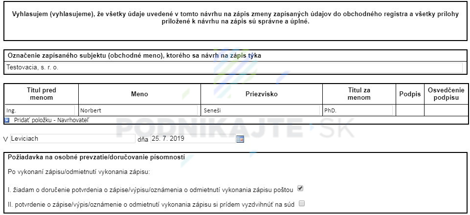 Nakoniec je potrebné uviesť miesto a dátum vyplnenia návrhu a krížikom označiť, či si prajete potvrdenie o vykonaní zápisu alebo oznámenie o odmietnutí vykonania zápisu nechať doručiť poštou alebo si ho vyzdvihnete osobne na registrovom súde.